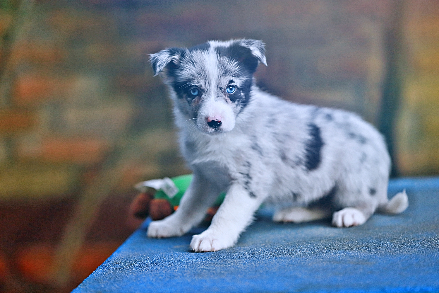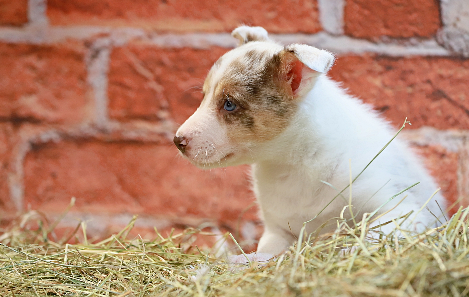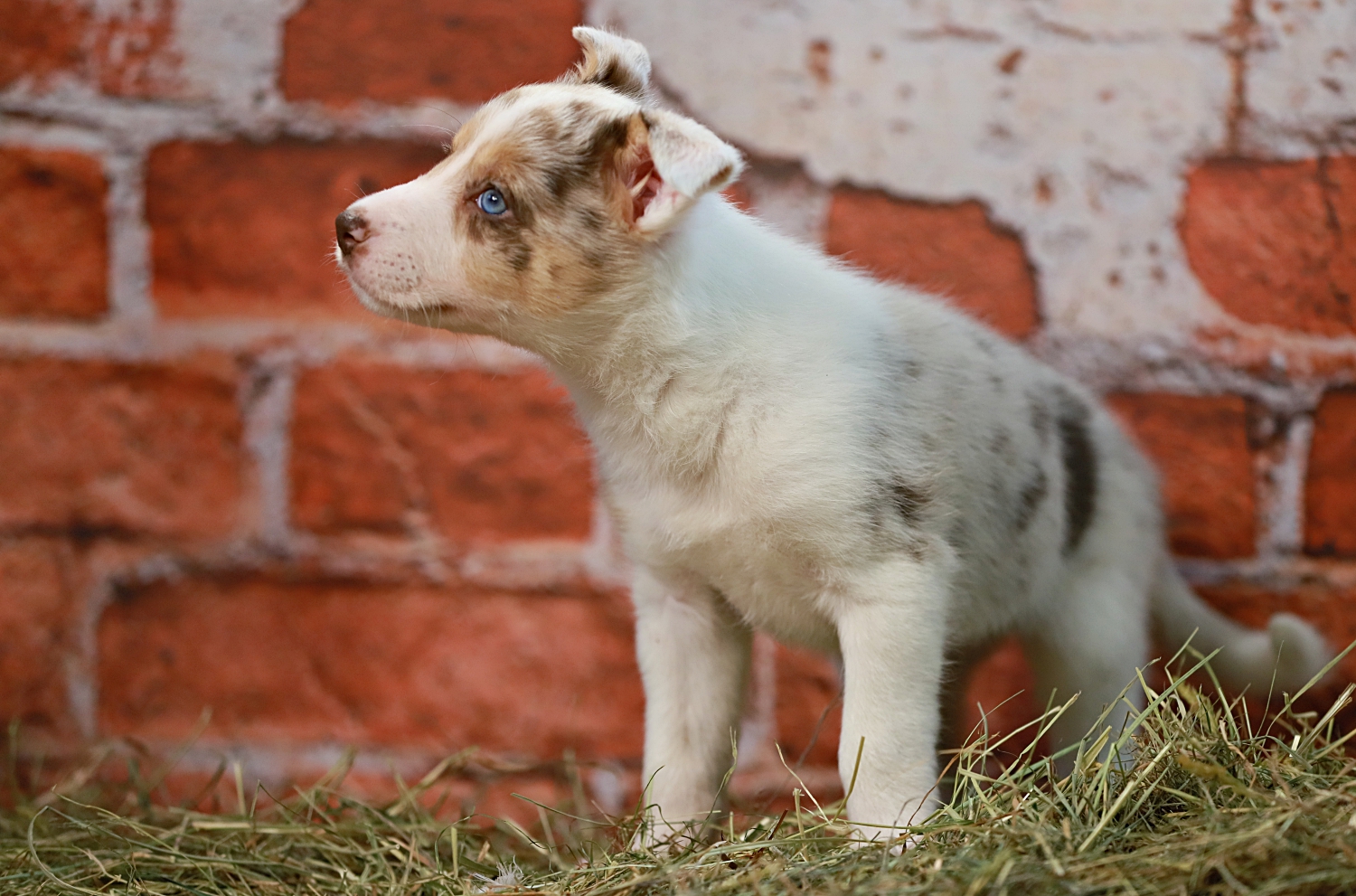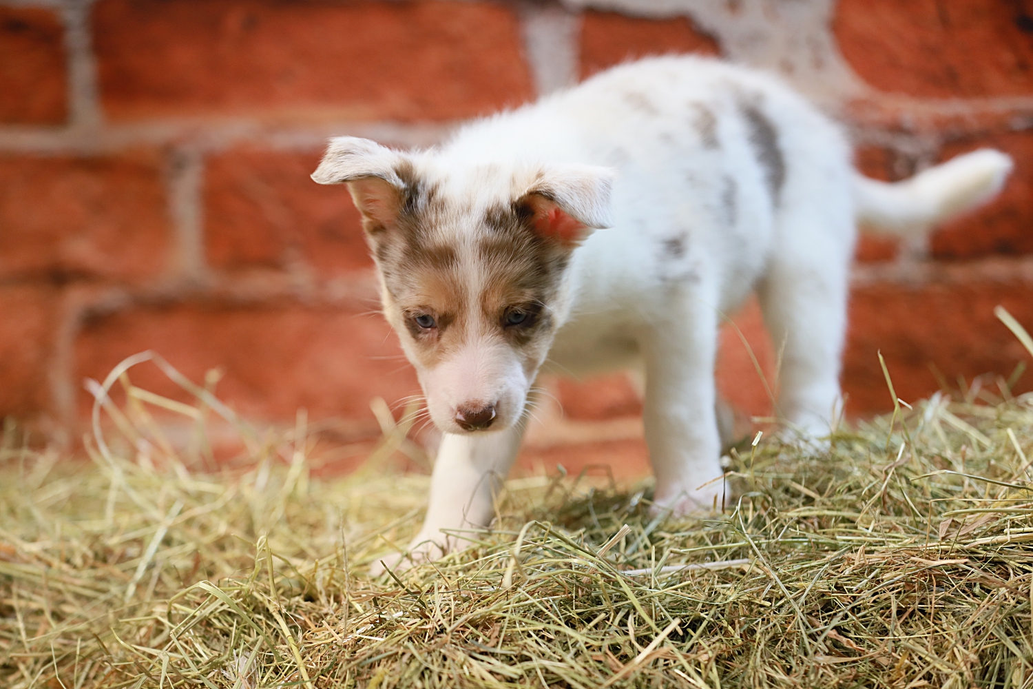 Jeszcze tylko jeden piesek szuka domu. Jest to piesek z miotu Żelki i Bosco – chłopak blue merle.
