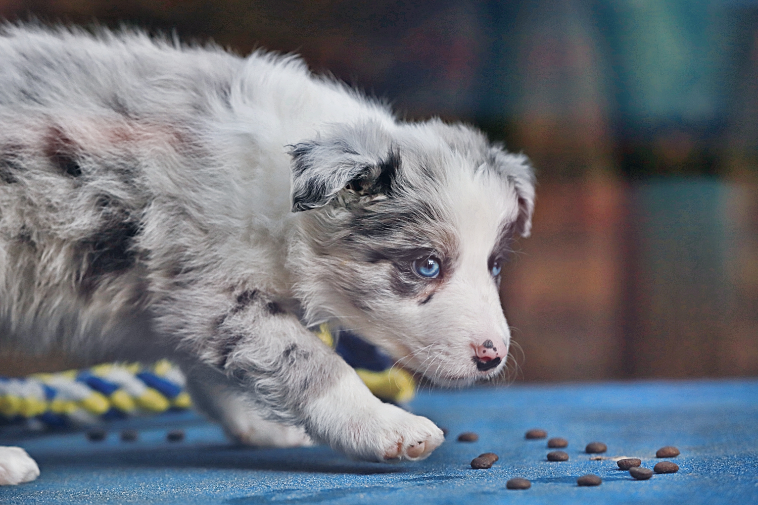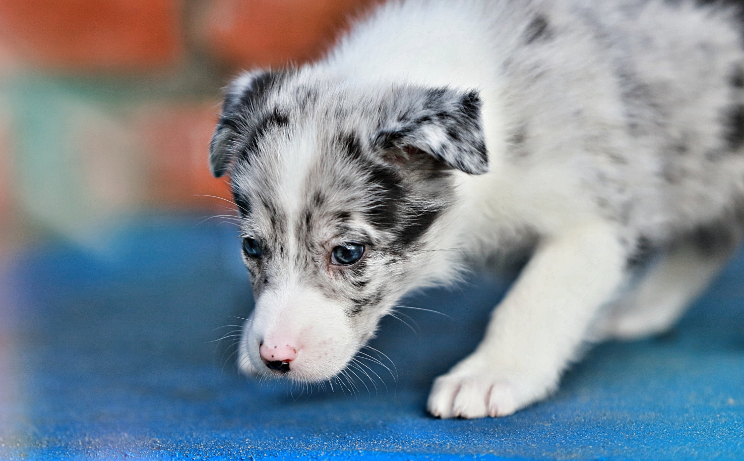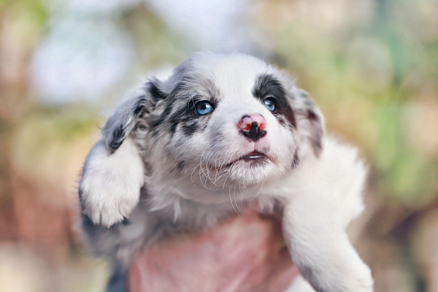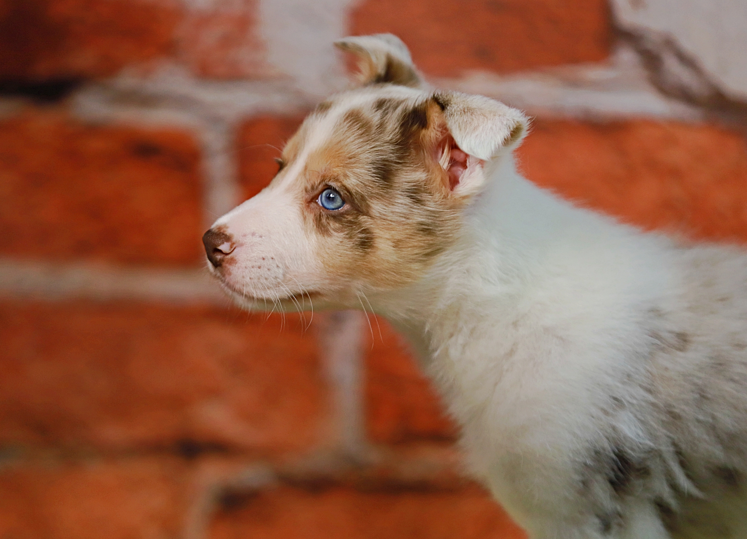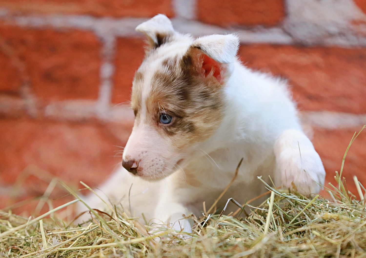 Jeszcze tylko jeden piesek szuka domu. Jest to piesek z miotu Żelki i Bosco – chłopak blue merle.