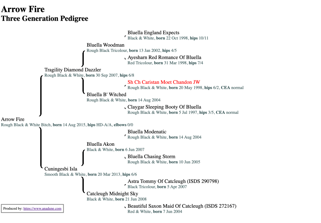 Arrow pochodzi z linii głównie sportowych, jest świeżą krwią w Polsce i w naszej hodowli. Jej ojciec i jego linie to linie Championów Agility w tym znany Woddy – Bluella Woodman, który jest ojcem wielu psów biegających w agility na Wyspach Brytyjskich. Natomiast matka pochodzi z linii pastersko wystawowych. Jest wnuczką słynnego Int Sup Ch Llangwm Bob (ISDS 224454).