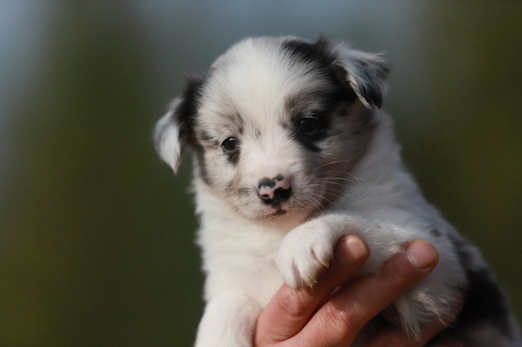 Cabot przy porodzie stracił ostatnią część paluszka w prawej łapce. Yoga mu odgryzla.. niechcący jak go oczyszczała. To końcówka, w której osadzony jest pazur, więc ma nieznacznie krótszy palec. Można nie zauważyć. Psu to w niczym nie przeszkadza, nie powoduje dyskomfortu. Więc jest wyjątkowy 🙂 Ma niebieskie oczko, jako jedyny w miocie 🙂